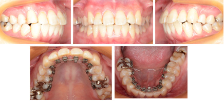 側貌に口もとの突出感はありませんでした。すでに下顎の左側第二大臼歯を失っています。そこで非抜歯でリンガルブラケットを用いて歯列矯正する事にしました。非抜歯での排列で重要な事は横顔、側貌です。口もとが突出しないか?横顔が悪くならないか?が問題です。日本人は鼻の高くない人種です。