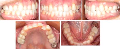 前歯部反対咬合です。すでに上顎右側第二大臼歯は失っています。また臼歯部には保険外の高額なセラミックなどで白く被せてあります。こういった白い保険外の歯には接着できません。変色しないとても硬い材質でできています。しかし、矯正治療できないわけではありません。色々な工夫することで治療は可能です。今回は非抜歯で限局的にリンガルブラケットを接着する事によってよい結果を得ました。