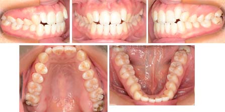 前歯は反対咬合の傾向をしめしますが、実際には前歯が前方に傾斜していて口もとが出ています。第一小臼歯を抜歯してリンガルブラケットで治療しました。