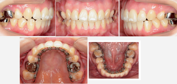 翼状捻転を歯を抜かずに治すと、この患者様の場合は出っ歯(上顎前突)になってしまいます。このために上顎の小臼歯だけを抜歯して排列しました。患者様は接客業をされています。リンガルブラケットは周囲の人に気づかれる事はありません。